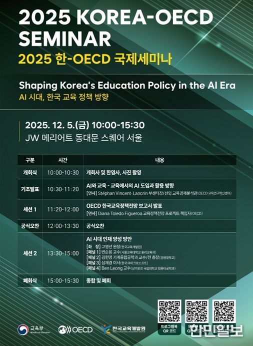 최교진 교육부 장관은 “인공지능(AI) 시대의 도래는 우리 교육에 혁신적인 전환을 요구하고 있다.”라고 말하며, “이번 토론회(세미나)를 통해 경제협력개발기구(OECD)와 함께 한국의 인공지능(AI) 교육 정책을 더욱 발전시키고, 모든 학생의 성장을 지원하는 미래교육 체제를 구축해 나가겠다.”라고 밝혔다.