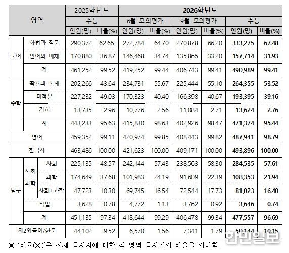 2026학년도 수능에 응시한 수험생은 493,896명으로 재학생은 333,102명, 졸업생과 검정고시 합격자 등은 160,794명이었다.