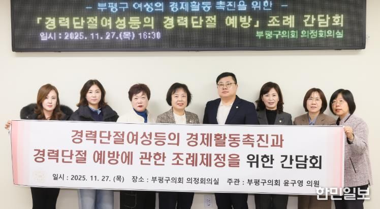 한민일보 서울포커스 김성혜 기자 | 인천 부평구의회는 지난 27일 의회 의정회의실에서 윤구영 의원(국민의힘, 삼산2동, 부개2ㆍ3동)이 대표발의한 '인천광역시부평구 경력단절여성등의 경제활동 촉진과 경력단절 예방에 관한 조례'제정을 위한 간담회를 진행했다.