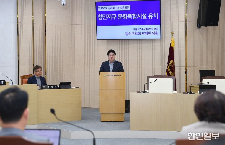 한민일보 서울포커스 박용남 기자 | 박해원 광산구의원(더불어민주당, 첨단1·2동)이 5일 열린 제301회 광산구의회 정례회 제2차 본회의에서 지속가능한 지역 성장 방안으로 ‘첨단지구 문화복합시설’ 유치를 제안하는 5분 자유발언을 펼쳤다.