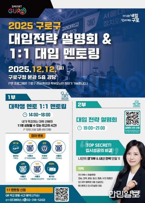 한민일보 서울포커스 진광성 기자 | 구로구는 이달 12일 구청 강당에서 대입을 준비하는 예비 수험생들을 위해 대입 전략 설명회와 일대일 상담(멘토링)을 운영한다.