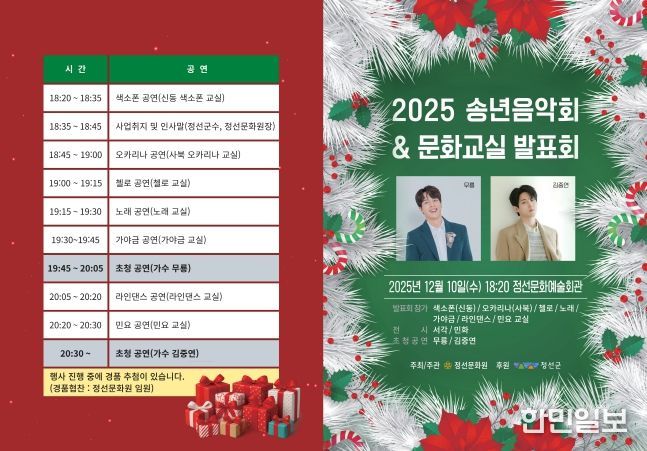 심재복 정선문화원 원장은 “정선 군민들이 함께 모여 따뜻하게 한 해를 마무리하는 시간이 되길 바라며, 수준 높은 공연과 발표를 준비한 만큼 많은 관심과 참여를 부탁드린다”고 전했다.