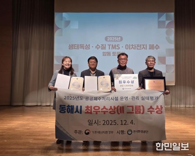 한민일보 서울포커스 임경복 기자 | 동해시는 2025년 기후에너지환경부가 실시한 공공폐수처리시설 운영관리실태평가 Ⅱ그룹(1,500톤~10,000톤)분야에서 우수기관으로 선정되어, 지난 12월4일 제주에서 열린 2025년 폐수합동 토론회에서 최우수상을 수상했다.