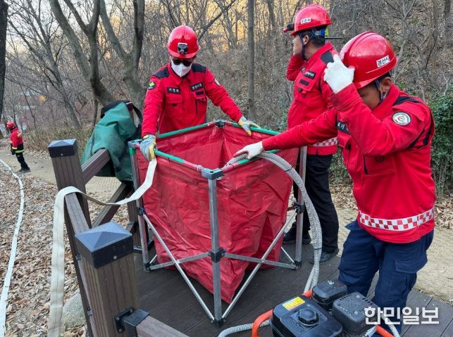 한민일보 서울포커스 최성훈 기자 | 경산시는 9일 겨울철 산불 조심 기간에 대비하여 산불 전문 예방 진화대를 중심으로 산불 진화 기계화 훈련을 실시했다고 밝혔다. 이번 훈련은 겨울철 춥고 건조한 기상 여건 속에 소규모 산불도 대형화될 우려가 커지는 만큼, 엔진 펌프를 활용한 기계화 진화 시스템의 운용 능력을 숙달하는 한편, 헬기·드론·지휘차 등 진화 자원을 입체적으로 연계한 통합 지휘 체계 운영 능력을 점검하는 데에 초점을 맞췄다.