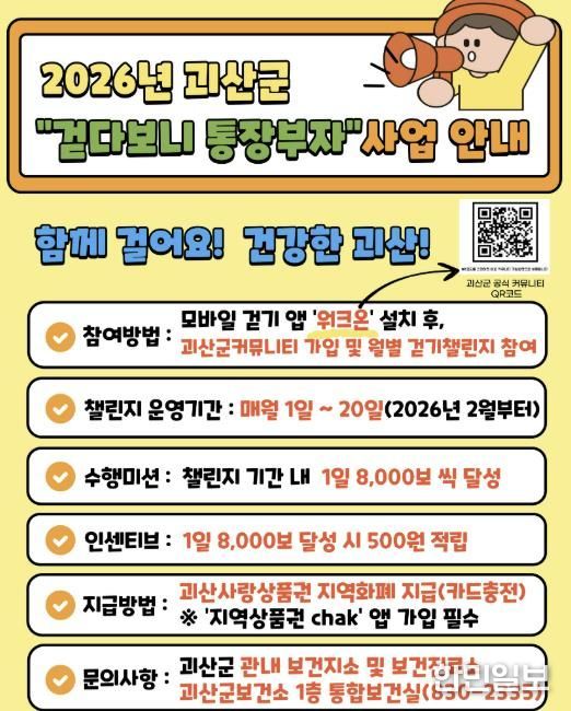 한민일보 서울포커스 김다남 기자 | 충북 괴산군은 군민의 건강 증진과 걷기운동 활성화를 위해 2026년부터 ‘걷다보니 통장부자’ 사업을 추진한다고 11일 밝혔다.