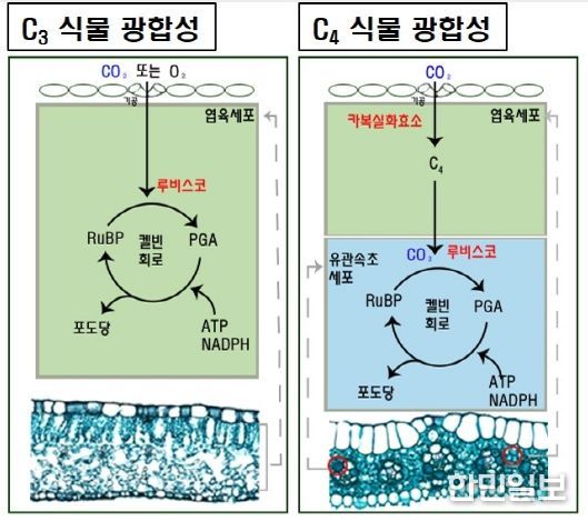 연구진은 섬과 연안 지역에 자생하는 주요 식물들의 잎 단면을 정밀 분석한 결과, 양명아주, 명아주, 솔장다리, 수송나물, 갯쇠보리 5종이 C4 식물로 확인됐다.