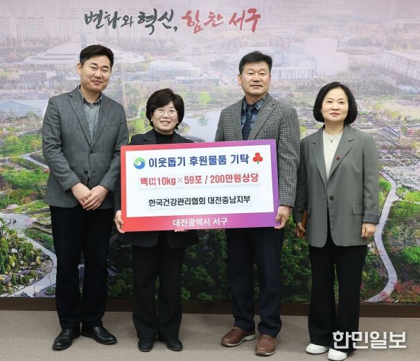 한민일보 서울포커스 임경복 기자 | 대전 서구는 15일 한국건강관리협회 대전·충남지부(대표 김인원)로부터 백미 10kg 59포(200만 원 상당)를 기탁받았다.