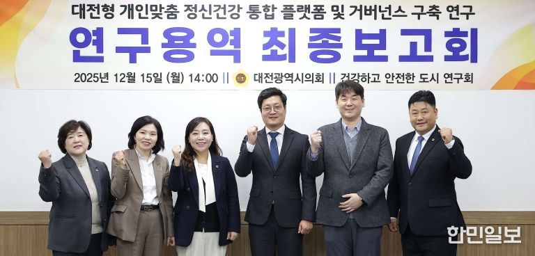 한민일보 서울포커스 유한희 기자 | 대전시의회 ‘건강하고 안전한 도시연구회(회장 김민숙 의원)’는 15일 시의회 공감실에서 ‘대전형 개인맞춤 정신건강 통합 플랫폼 및 거버넌스 구축’ 연구 용역 최종 보고회를 개최했다.