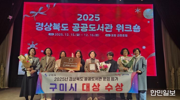 한민일보 서울포커스 김봉순 기자 | 구미시는 지난 15일 열린 ‘2025 경상북도 공공도서관 워크숍’ 내 ‘공공도서관 운영평가 시상식’에서 도내 43개 공공도서관 중 전체 1위를 차지했다. 그룹별 평가에서도 구미시립중앙도서관이 A그룹 대상을, 구미도시공사 소속 봉곡도서관이 B그룹 우수상을 받으며 2년 연속 두 개관이 동시에 수상하는 성과를 거두었다.