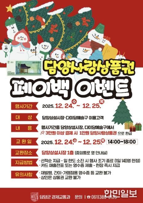 한민일보 서울포커스 임경복 기자 | 담양군은 연말 소비 진작과 지역 상권 활성화를 위해 12월 23일부터 25일까지 담양읍 중앙로와 담양시장 일원에서 ‘담양사랑상품권 페이백 행사’를 운영한다.