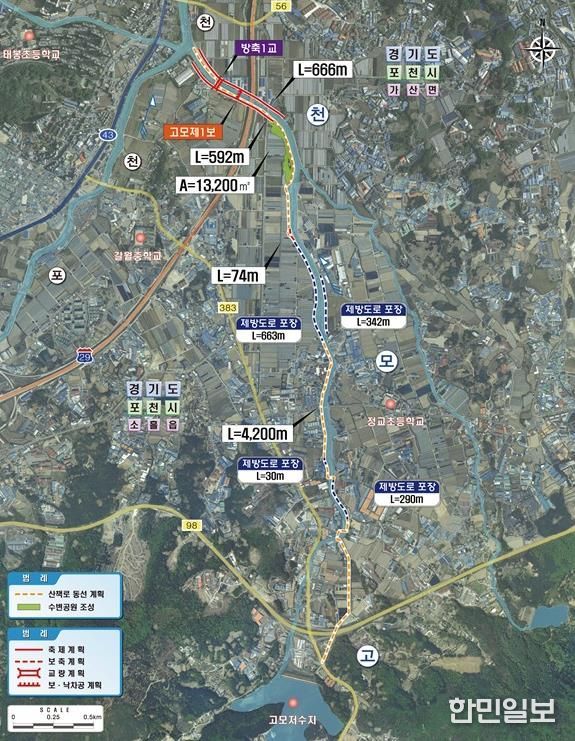정비사업은 포천시 소흘읍 고모리에서 가산면 일원까지 총 연장 4.1km 구간을 대상으로 추진된다. 하천 제방 1.26km 보강을 통해 고모천의 홍수 대응 능력을 우선 개선하고 하천 유휴지를 활용하여 수변공원과 산책로를 조성해 주민들이 안전하게 이용할 수 있도록 하는 사업이다.