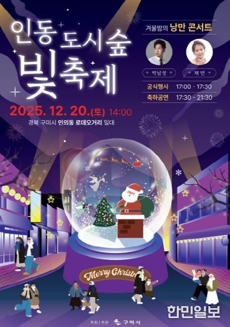 한민일보 서울포커스 김봉순 기자 | 구미시는 오는 12월 20일 인동로데오거리 일원에서 청춘의 에너지와 음악이 어우러지는 '2025년 인동도시숲빛축제'를 개최한다.