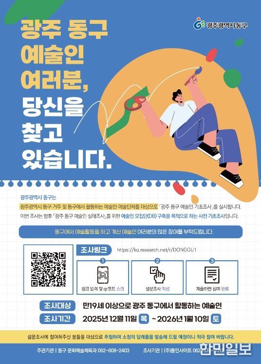 한민일보 서울포커스 임경복 기자 | 광주 동구는 내년 1월 10일까지 관내 거주하거나 활동하는 지역 예술인·예술단체를 대상으로 ‘광주 동구 예술인 기초조사’를 실시한다고 밝혔다.