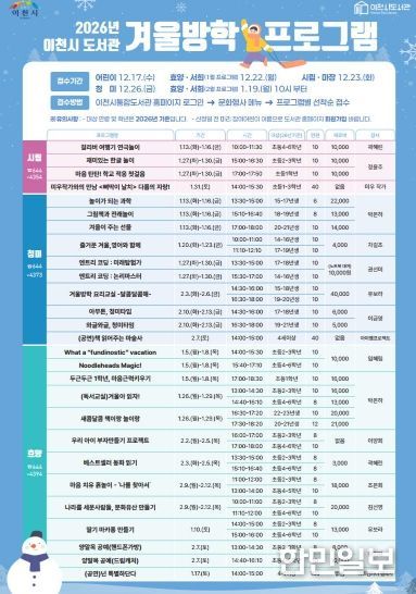 한민일보 서울포커스 박용남 기자 | 이천시는 2026년 1월부터 2월까지 겨울방학 기간에 어린이를 대상으로 한 다양한 독서문화 프로그램을 운영한다고 밝혔다.