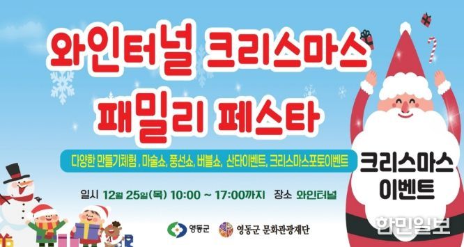 한민일보 서울포커스 김다남 기자 | 충북 영동군 문화관광재단은 오는 25일 오전 10시부터 오후 5시까지, 영동와인터널에서 ‘2025 영동와인터널 크리스마스 행사’를 개최해 영동와인터널과 레인보우 힐링관광지의 매력을 널리 알리고, 크리스마스를 맞은 군민과 관광객들에게 특별한 연말 체험과 즐거움을 제공할 예정이다.