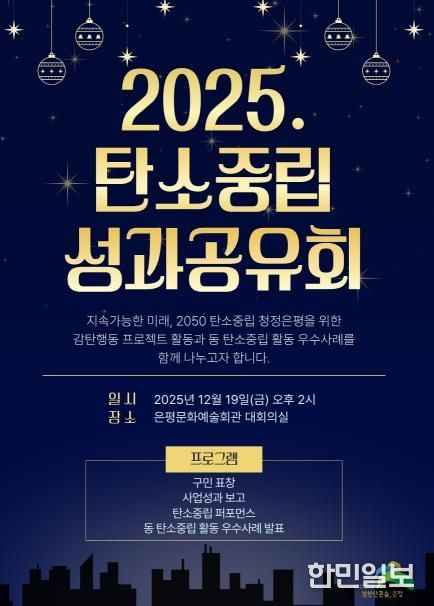 한민일보 서울포커스 임광현 기자 | 서울 은평구는 오는 19일 은평문화예술회관 대회의실에서 ‘2025. 탄소중립 성과공유회’를 개최한다고 밝혔다.