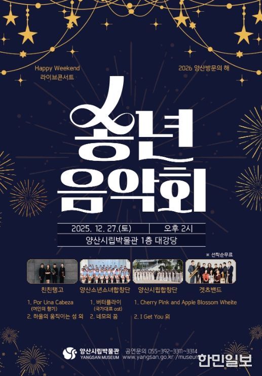 한민일보 서울포커스 김은금 기자 | 양산시립박물관은 다사다난했던 한해를 마무리하고 2026년을 희망차게 맞이하고자 오는 27일 오후 2시 시립박물관 대강당에서 ‘송년음악회’를 개최한다.