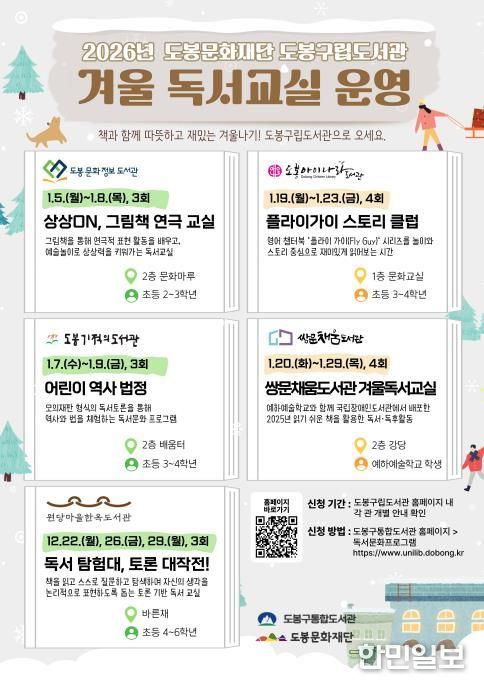 한민일보 서울포커스 김봉순 기자 | 서울 도봉구 도봉문화재단 소속 구립도서관 5개관이 ‘2026년 겨울 독서교실’을 운영한다.
