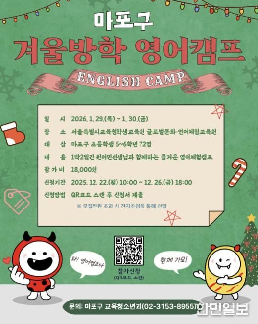 한민일보 서울포커스 박정민 기자 | 마포구는 겨울방학을 맞아 관내 초등학교 5~6학년 학생 72명을 대상으로 2026년 1월 29일부터 30일까지 1박 2일 일정의 겨울방학 영어캠프를 운영한다.