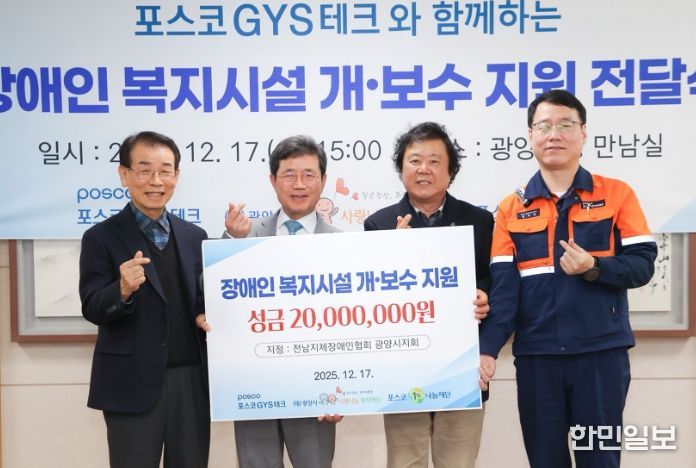 한민일보 서울포커스 임광현 기자 | 광양시는 지난 17일 포스코GYS테크가 사회복지시설 개·보수를 위한 지정기탁금 2천만 원을 전남지체장애인협회 광양시지회에 전달했다고 밝혔다.