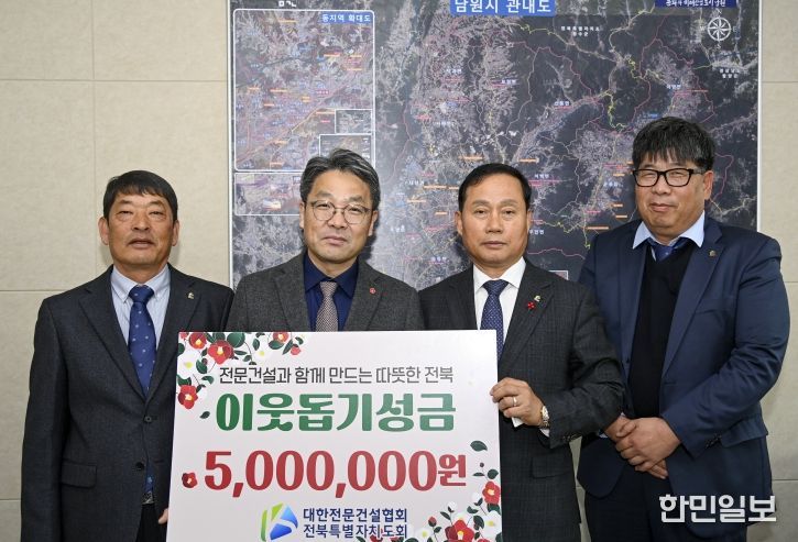 한민일보 서울포커스 박용남 기자 | 남원시는 12월 19일 대한전문건설협회 전북도회(회장 임근홍)와 남원지회(회장 김재주)가 '희망2026 나눔 캠페인'에 동참하며 500만 원의 성금을 기탁했다고 밝혔다.
