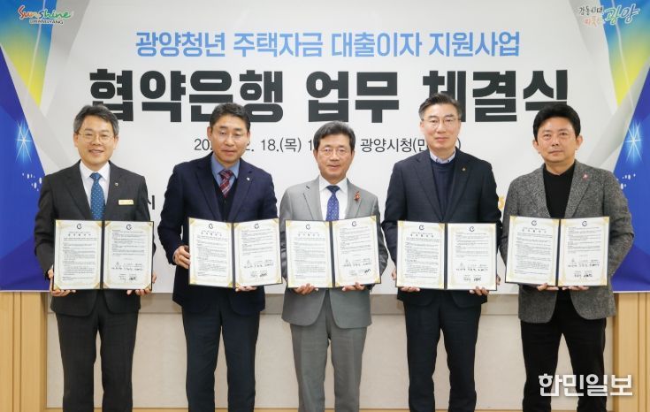 한민일보 서울포커스 임광현 기자 | 광양시는 2026년도 청년주택자금 대출이자 지원사업 추진에 앞서 보다 효율적인 사업 운영을 위한 협력 체계를 구축하고자, 지난 19일 시청 만남실에서 관내 4개 금융기관(신한은행, NH농협은행, 광양농협, 동광양농협)과 청년 주택자금 대출이자 지원사업업무협약을 체결했다.