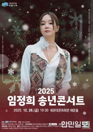 한민일보 서울포커스 임광현 기자 | 해운대문화회관은 오는 12월 26일 오후 7시 30분, 해운대문화회관 해운홀에서 송년 특별기획 공연인 ‘2025 임정희 송년콘서트’를 개최한다.