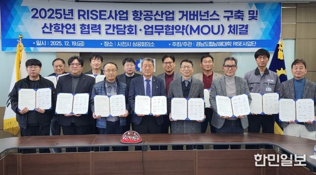 한민일보 서울포커스 임경복 기자 | 경남도립남해대학(총장 노영식)은 19일 오전 10시 30분, 사천시 상공회의소 3층 회의실에서 지역 항공산업의 지속 가능한 성장과 경쟁력 강화를 위해 ‘2025 RISE·글로컬대학사업 성과 확산을 위한 항공산업 지·산·학 협력 거버넌스 구축 및 업무협약(MOU) 체결식’을 개최했다.