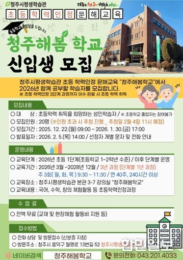 한민일보 서울포커스 김다남 기자 | 청주시는 초등학력 취득을 희망하는 성인 학습자를 위한 학력 인정 문해교육 프로그램 ‘청주해봄학교’의 2026학년도 신입생을 모집한다고 20일 밝혔다.