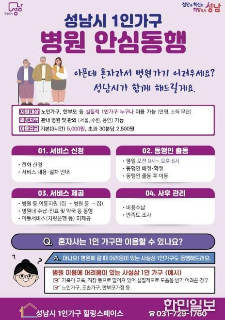 한민일보 서울포커스 김성혜 기자 | 성남시는 ‘1인 가구 병원 안심 동행 서비스’ 추진을 위해 전문 인력을 기존 4명에서 5명으로 늘렸다고 22일 밝혔다.