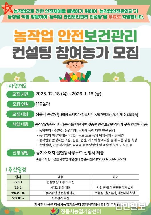 시는 ‘2026년 농작업 안전재해예방 지원체계 구축사업’의 일환으로 내년 1월 16일까지 ‘농작업 안전보건관리 컨설팅’에 참여할 농가를 모집한다고 22일 밝혔다.
