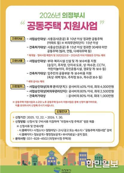 한민일보 서울포커스 심기옥 기자 | 의정부시는 노후 공동주택의 관리비용 부담 완화와 주거환경 개선을 위해 내년 1월 30일까지 ‘2026년 공동주택 지원사업’ 신청을 받는다.