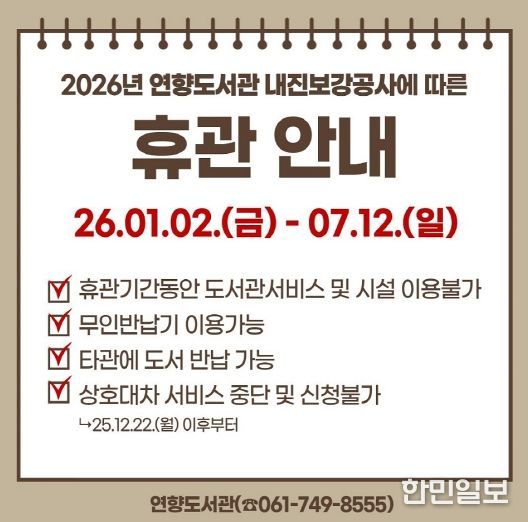 한민일보 서울포커스 임광현 기자 | 순천시는 연향도서관의 지진 대응 능력을 강화하고 시민들에게 안전한 독서 환경을 제공하기 위해 내년 상반기 내진성능 보강공사를 실시한다고 밝혔다.