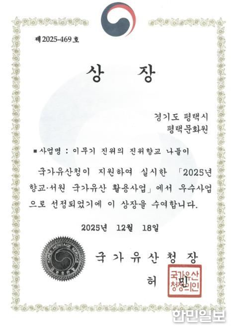 한민일보 서울포커스 황준형 기자 | 평택문화원은 12월 18일 대전 전통나래관 다목적강당에서 열린 국가유산청 주최 ‘2025 우리고장 국가유산 활용 우수사업 시상식’에서 평택문화원의 ‘이무기 진위의 진위향교 나들이’가 우수사업(국가유산청장상)으로 수상했다.