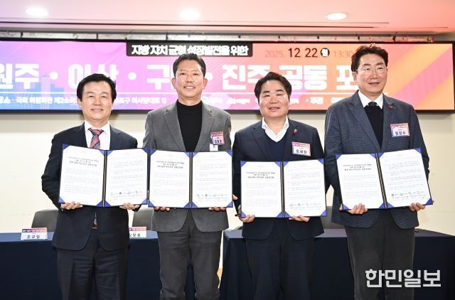 한민일보 서울포커스 김봉순 기자 | 구미시는 원주시·아산시·진주시와 함께 12월 22일 국회의원회관 제2소회의실에서 ‘지방자치와 지역균형성장을 위한 공동포럼’을 개최하고,'지방자치분권 및 지역균형발전에 관한 특별법(이하 지방분권균형발전법)' 개정을 촉구하는 공동건의문을 채택했다.