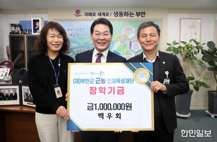 한민일보 서울포커스 김용택 기자 | 부안군 백산면 출신 공무원 모임인 백우회(회장 은진)는 22일 부안군근농인재육성재단을 방문해 지역인재 육성을 위한 장학금 100만 원을 기탁했다.