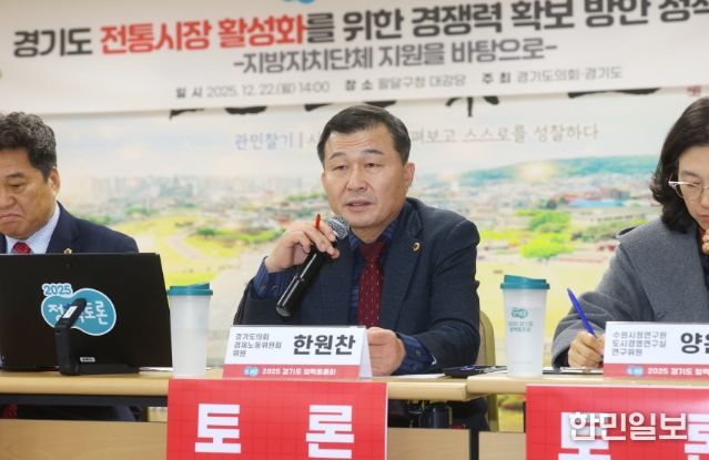 한민일보 서울포커스 김윤이 기자 | 경기도의회 경제노동위원회 소속 한원찬 의원(국민의힘, 수원6)은 22일 수원특례시 팔달구청 대강당에서 개최된 ‘경기도 전통시장 활성화를 위한 경쟁력 확보 방안 정책 토론회’에 토론자로 참석했다. 이번 토론회는 지방정부의 전통시장 및 상점가 육성을 위한 지원 방안 개선책을 모색하고, 경기도 전통시장이 단순한 활성화를 넘어 실질적인 경쟁력을 확보하기 위한 전략을 논의하고자 마련됐다.