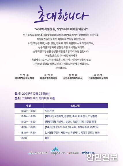 한민일보 서울포커스 곽중희 기자 | 강원특별자치도는 12월 23일 코트야드 바이 메리어트 세종에서 강원, 제주, 세종, 전북 4개 특별자치시도지사들이 모여 대한민국특별자치시도 행정협의회 두 번째 정기회의를 개최했다.