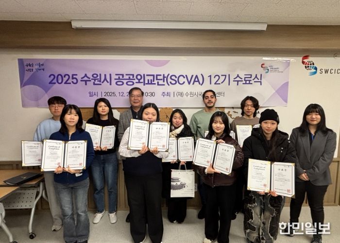 한민일보 서울포커스 진광성 기자 | 수원시국제교류센터가 22일 센터에서 ‘수원시 공공외교단(SCVA) 12기’ 수료식을 열고, 단원 16명에게 수료증을 전달했다. 우수활동자 4명에게는 상장을 수여했다.