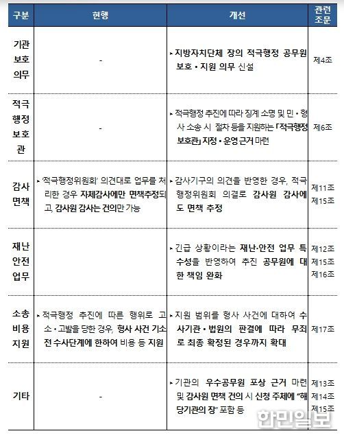 적극행정 추진으로 징계 소명 및 민·형사상 소송이 진행되는 경우 소속기관 차원의 보호·지원이 의무화되고, 적극행정 보호관을 지정해 공무원을 보호해야 한다.