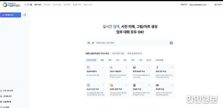 한민일보 서울포커스 김윤이 기자 | 세종특별자치시시설관리공단은 챗GPT, 제미나이 등 다양한 생성형 인공지능 프로그램을 하나의 환경에서 활용할 수 있는 인공지능 통합 플랫폼을 도입해 지능형 업무 환경 구축에 나선다고 밝혔다.