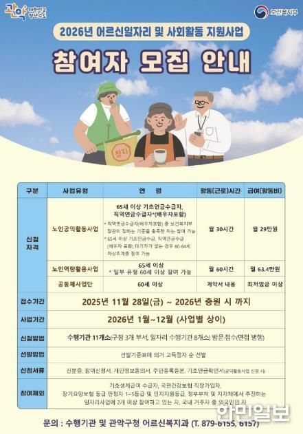한민일보 서울포커스 곽중희 기자 | 관악구가 초고령시대 진입을 앞두고 어르신들의 사회참여 증진과 노후 소득 보장을 위해 ‘2026년 노인일자리 및 사회활동 지원사업’을 대폭 확대 추진한다.