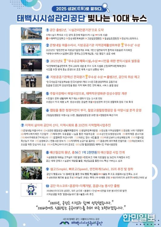 한민일보 서울포커스 임경복 기자 | 태백시시설관리공단은 출범 2년을 맞아 2025년 한 해 동안의 주요 성과를 집약한 '2025년 공단 10대 뉴스'를 선정했다고 밝혔다.