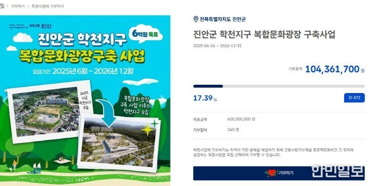 한민일보 서울포커스 박용남 기자 | 진안군이 고향사랑기부제 지정기부사업으로 지난 6월부터 추진 중인 “학천지구 복합문화광장 구축사업”이 모금 시작 6개월 만에 누적 모금액 1억 원을 달성했다.
