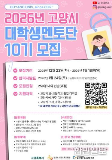 한민일보 서울포커스 김은금 기자 | 고양특례시가 지역 청소년들의 진로 설계를 도울 대학생 멘토단 ‘고양유니브’의 2026년도 신입 단원을 1월 18일까지 모집한다고 밝혔다.