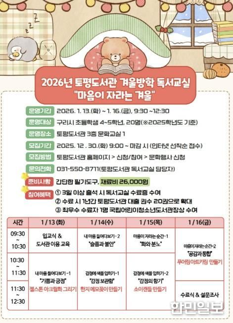 한민일보 서울포커스 임경복 기자 | 구리시는 오는 2026년 1월 12일부터 1월 16일까지 시립도서관 중 인창·토평·갈매도서관에서 겨울방학을 맞은 초등학생들을 대상으로 다양한 독서 교실 프로그램을 운영한다.