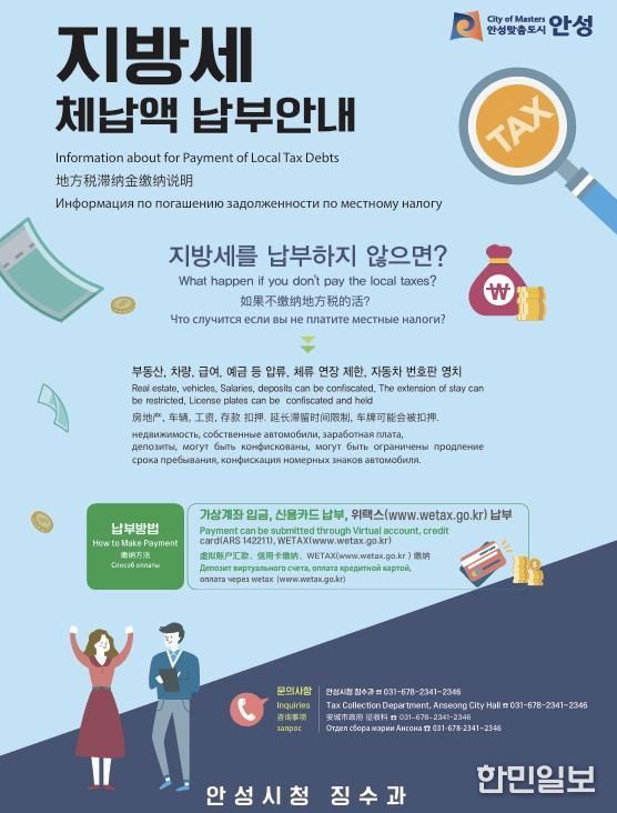 한민일보 서울포커스 임경복 기자 | 안성시는 외국인 근로자의 지방세 체납액 징수를 위해 외국인 전용보험 압류를 추진한다고 밝혔다.