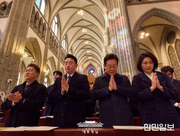 한민일보 서울포커스 김윤이 기자 | 이재명 대통령과 김혜경 여사가 25일 서울 중구 명동대성당에서 열린 성탄 대축일 미사에서 기도를 하고 있다.