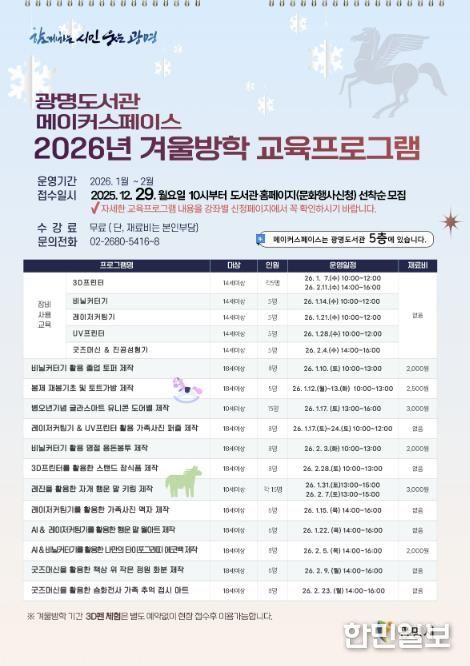 한민일보 서울포커스 임광현 기자 | 광명시 광명도서관은 오는 29일부터 ‘메이커스페이스 2026년 겨울방학 교육 프로그램’ 참가자를 모집한다.