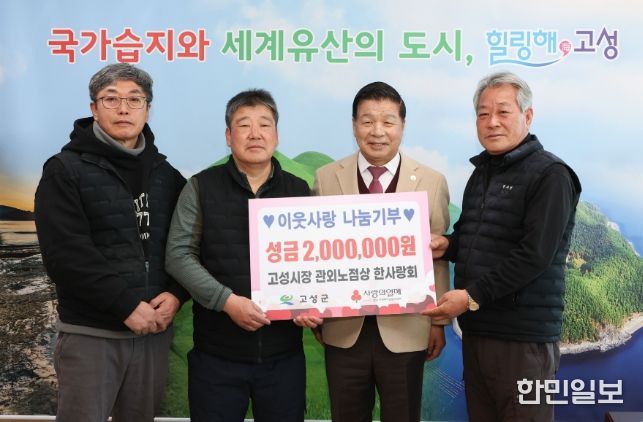 한민일보 서울포커스 김은금 기자 | 고성군은 12월 26일 고성시장 관외노점상 한사랑회(회장 전후동)에서 연말을 맞아 지역 내 어려운 이웃을 위해 성금 200만 원을 기탁했다고 밝혔다.